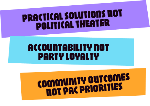 Two-party politics has trapped voters in a lesser of two evils cycle for too long. Communities get ignored while party machines and special interests win. We exist because that arrangement was never going to fix itself.